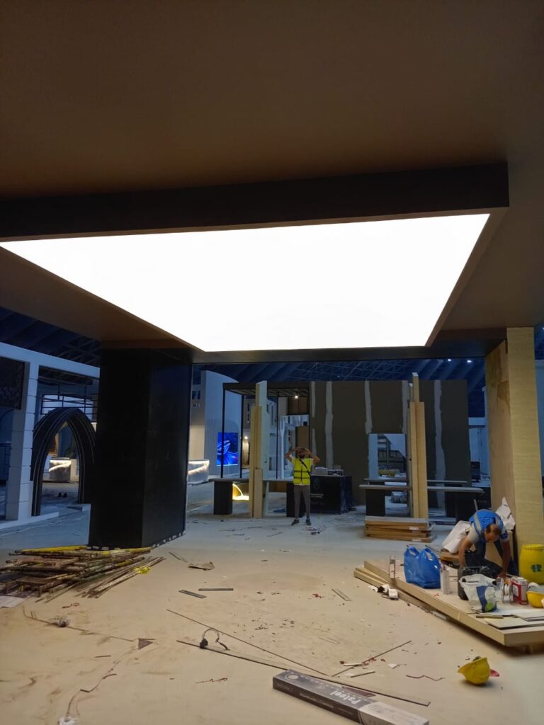 توزيع ضوئي متوازن خلف السقف المشدود، مثالي للمشاريع الراقية والمعارض داخل السعودية.